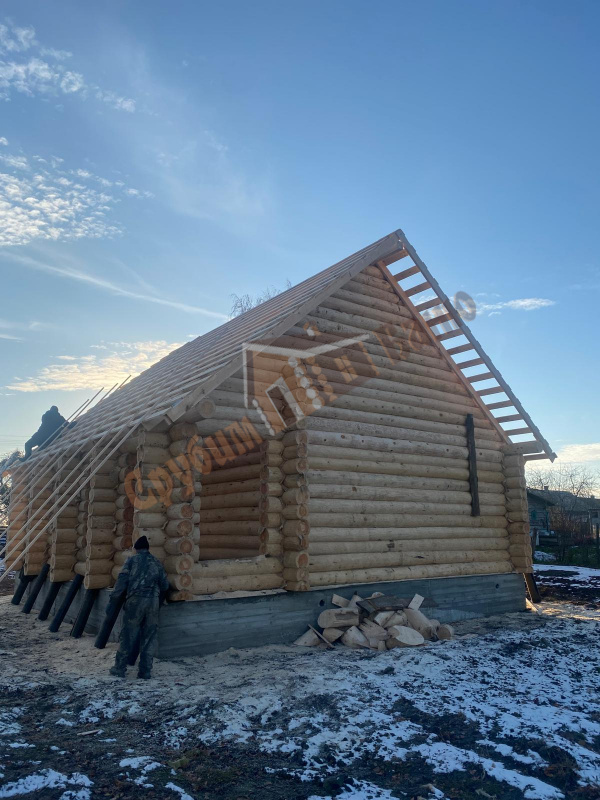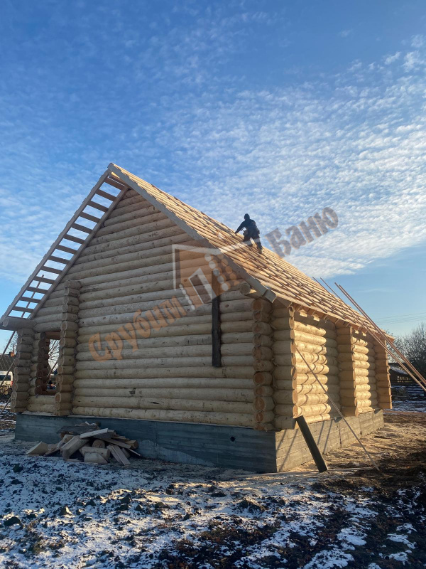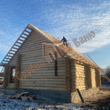 | Ленинградская обл., г. Кингисепп | 3х5 стандарт с доп. венцом. Обвязка из бруса. Фронтоны вагонка, обрешетка и рубероид. |
