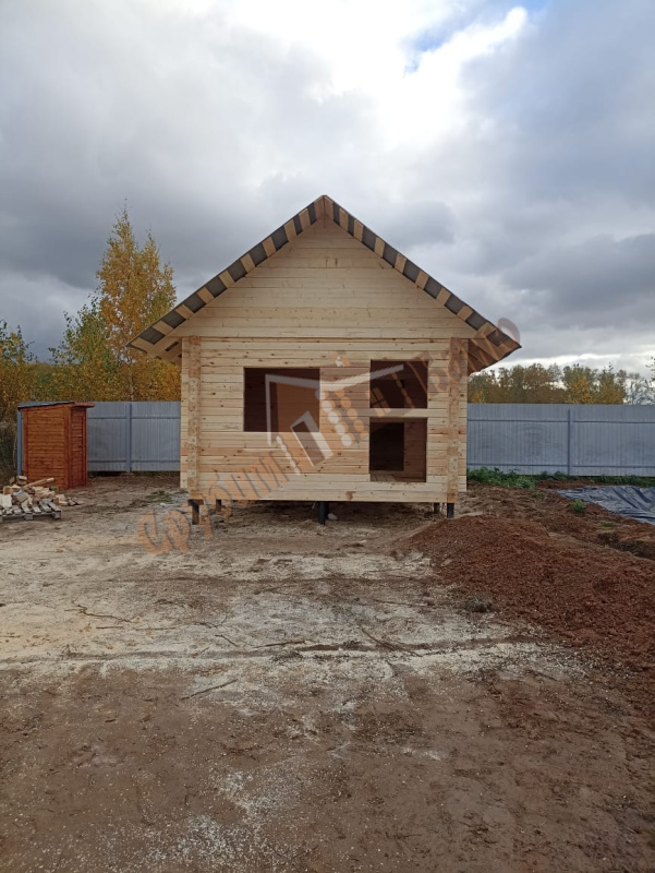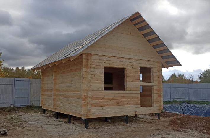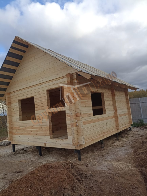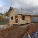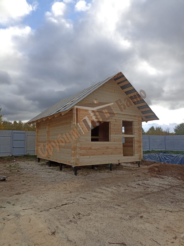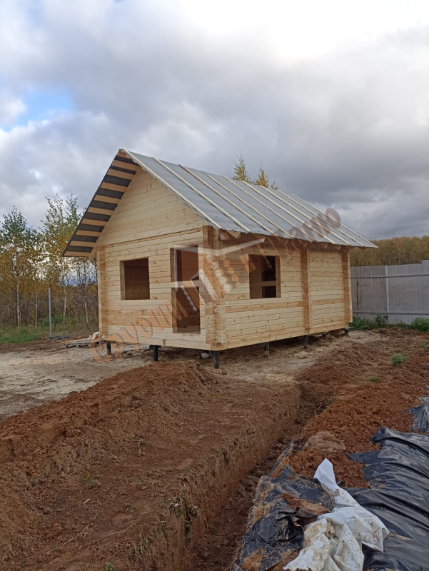 Информация по проекту: баня 4х5,4 м из профилированного бруса камерной сушки ширина стенки 140 мм. Установка на свайно-винтовом фундаменте - 12 свай 108/2500 с обвязкой из бруса 150х200 мм и лагами 50х150 мм с шагом 580 мм под утеплитель.