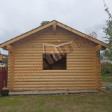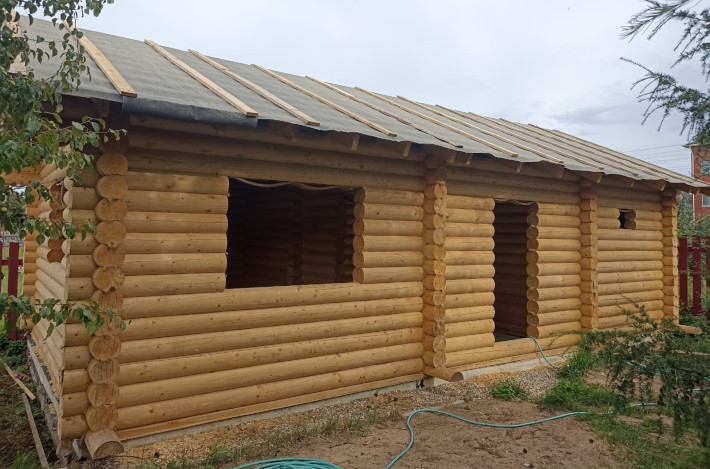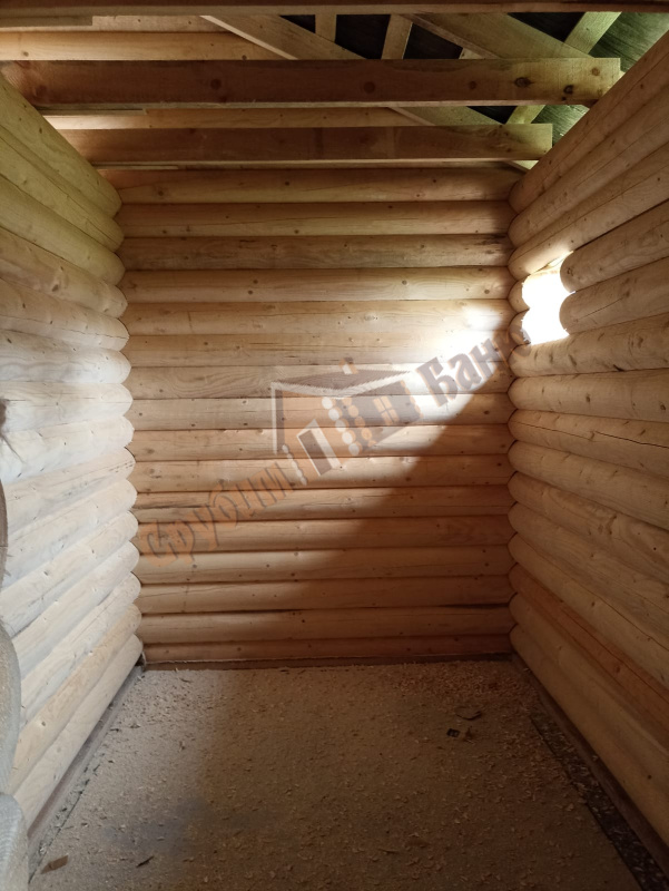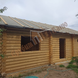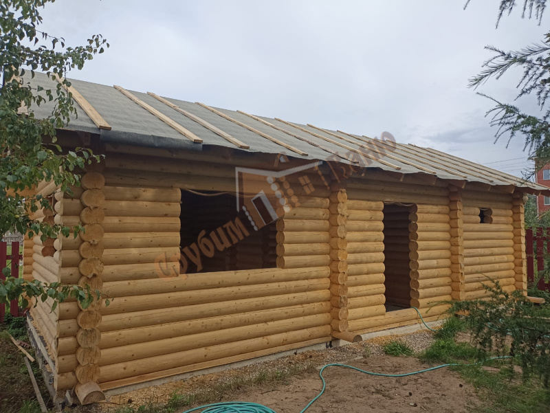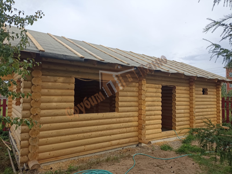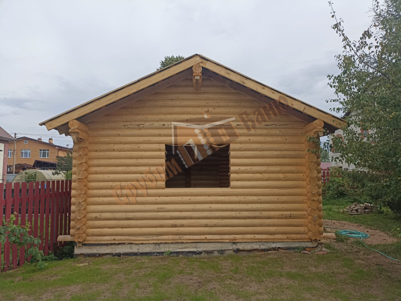 Информация по проекту: баня 5,1*9 метра из оцилиндрованного бревна 200 мм. Плита заказчика, все остальное делали мы. Стоимость указана с учетом доставки и монтажа под временную кровлю.