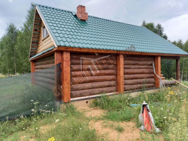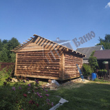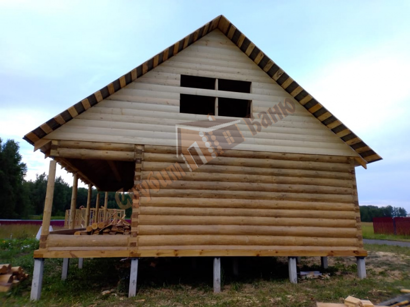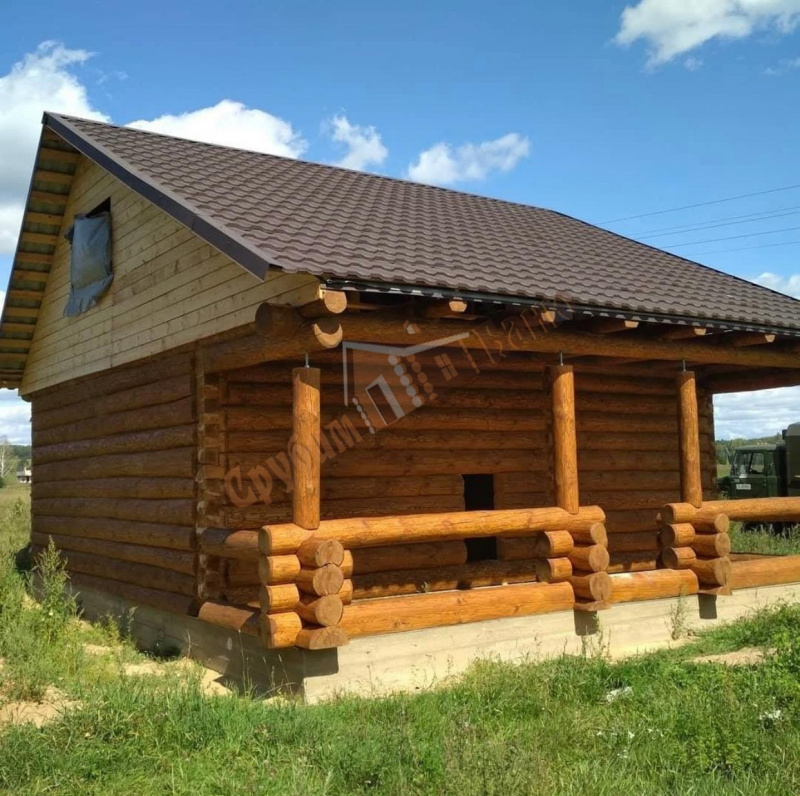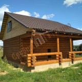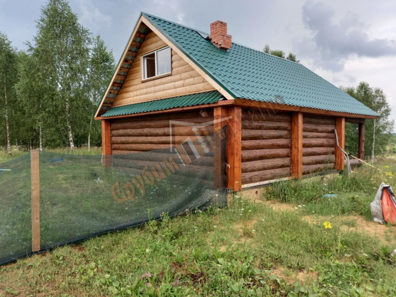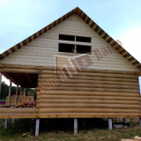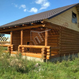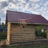 | Московская область, г. Домодедово | 5х5 стандарт с террасой 2х5. Лапа/кругляк. Доп. венец. Двухскатная мансардная крыша. Фронтоны вагонка, обрешетка и рубероид. Обвязка из бруса. |